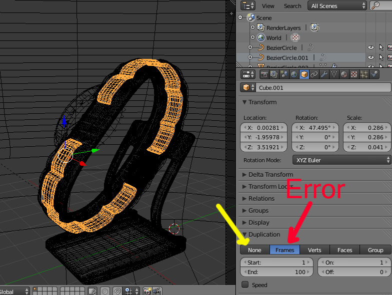En Object > Duplication > tienes marcado Frames que no debería estar.