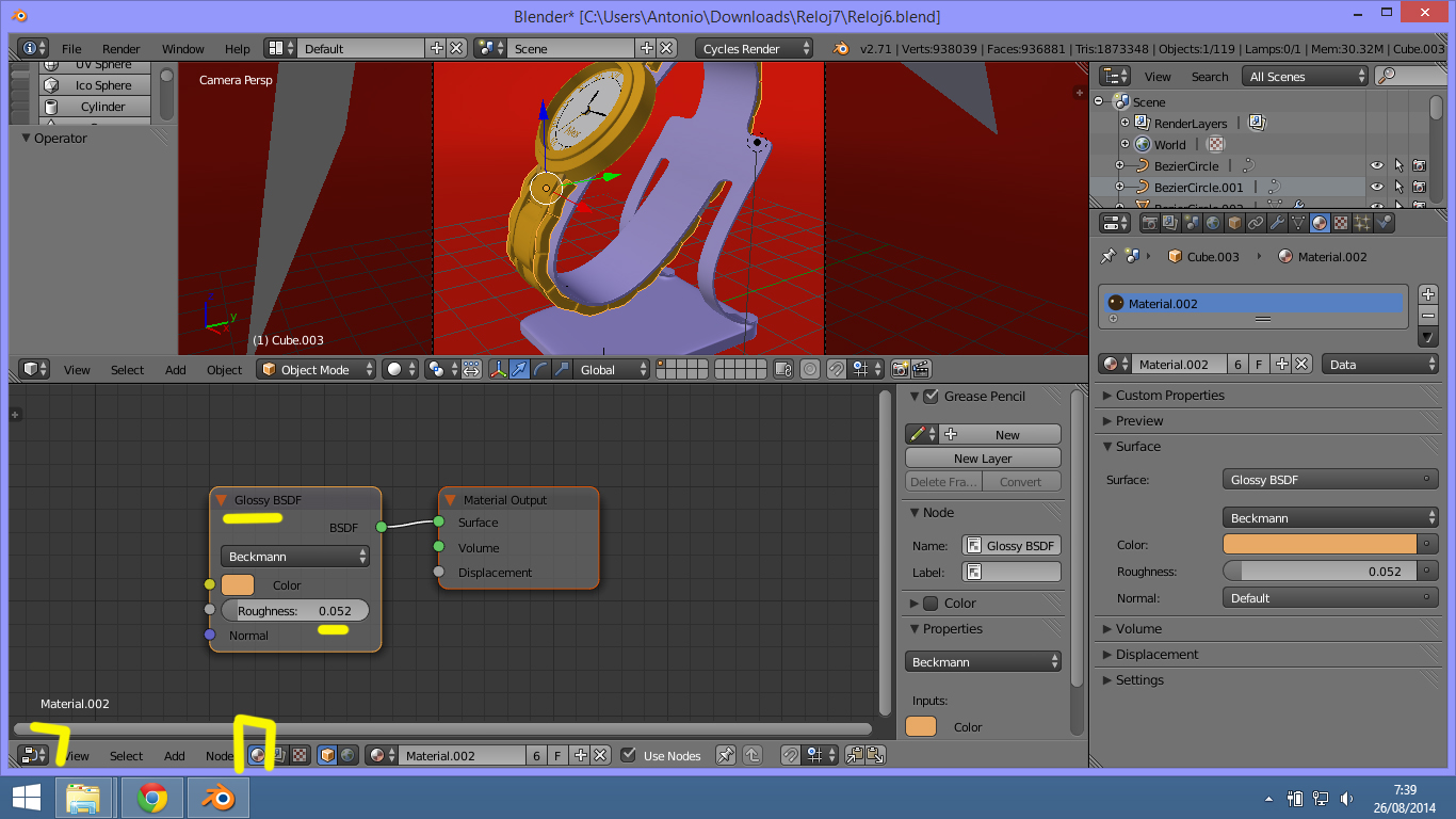 Como puedo crear la textura metálica? Perdón que pregunte tanto, es que es mi primera vez con Cycles y la mayor parte de mi tiempo lo que he hecho es modelar, hasta ahora me estoy tirando al texturizado y renderizado con Cycles.