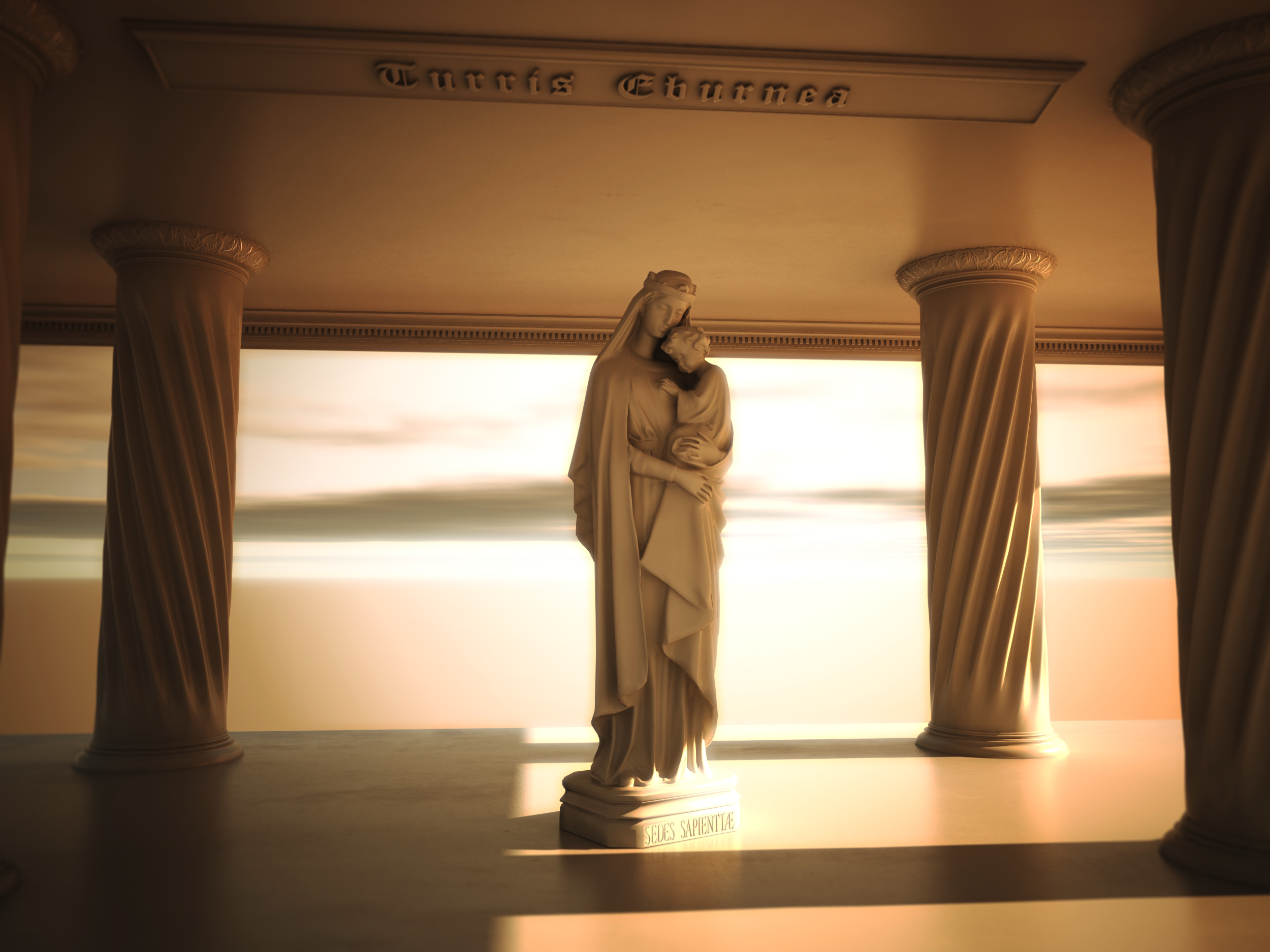 Lo que dice en la base de la estatua es Sedes SapientiAE (sede de la sabiduría) y es uno de los tantos halagos que se le hacen a la Santa Madre en las llamadas letanías. Otro delos halagos de la larga lista es Turris ebúrnea lo que significa torre de marfil, razón por la cual me ha inspirado a darle a la escena ese monocromo que recuerda al marfil. Saludos.