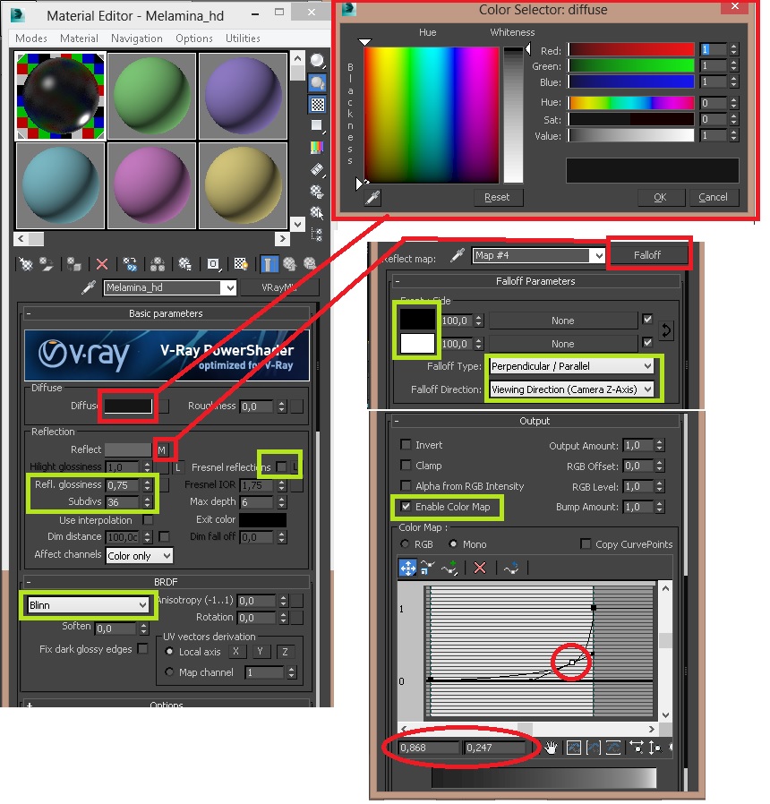 Solo el diffuse. La melamina la estuve mirando un rato, es decir, un mueble blanco que tengo aquí en casa. Me di cuenta que es como el plástico, pero sin ss. En reflect en vez de activar el fresnel, active esta propiedad con un mapa fallof, que la puedes manejar mejor, le di esa curva justamente para qué si es observado desde arriba (perpendicular a su superficie) no reflejara casi nada. Y si la cámara es colocada casi rasante a la superficie (paralela) refleje casi perfectamente.
