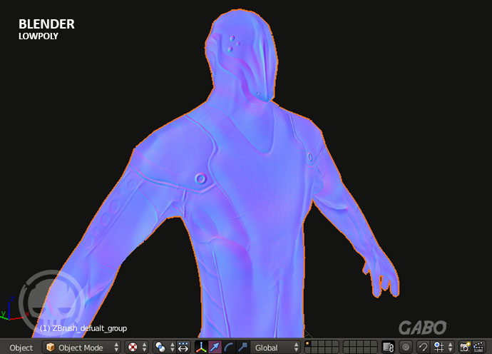 Estoy creando un personaje en Low Poly para un videojuego, he usado ZBrush para crear el mapa de normales y algunas texturas que me van a servir para mapear en Blender.