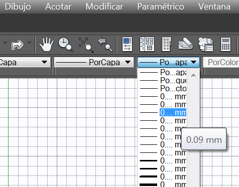 El problema consiste en que la ventana en la qué aparecen los gruesos de línea es muy estrecha y no veo la leyenda correspondiente. Necesito poner el cursor encima para ver el grueso señalado, cómo se puede ver en la imagen adjunta. Esto, que no parece un problema, resulta bastante incómodo.