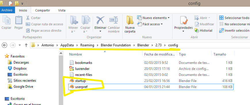 Pero en Blender, el archivo que guarda las preferencias y los valores, se encuentra en una carpeta oculta en lo que es la ROAMING de Windows 8.1 (en mi caso)