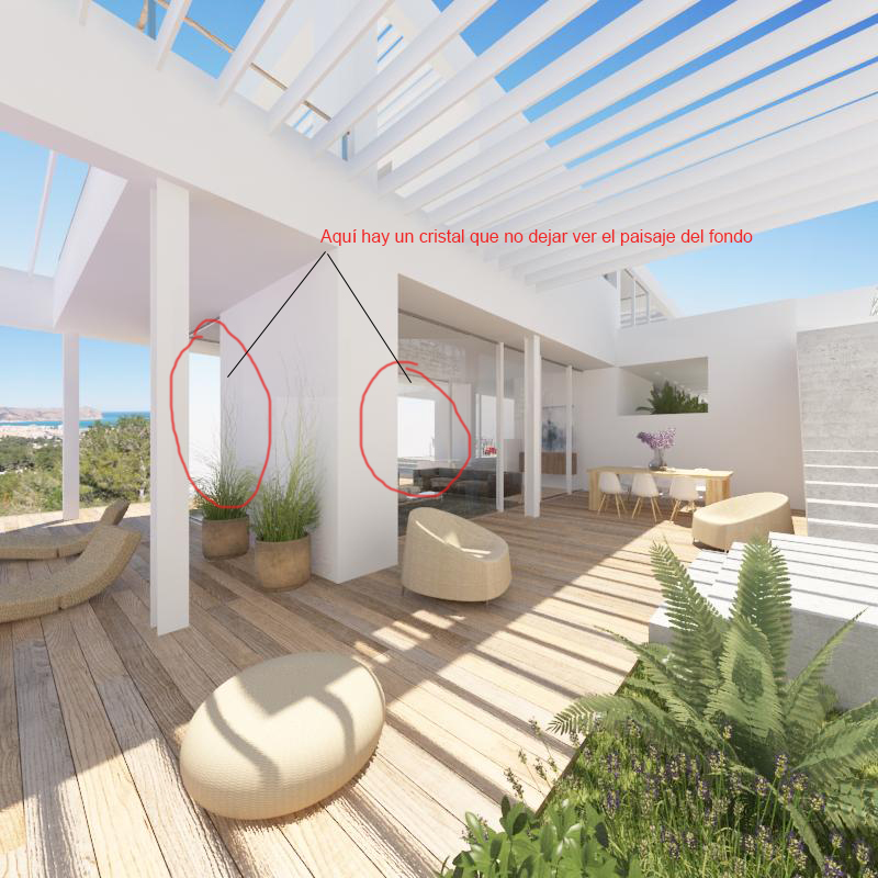 Tengo una escena en la cual, como fondo he puesto un plano con una imagen que me sirve de fondo. El problema es que está imagen, cuando queda detrás de un cristal no aparece tal como podéis ver en la imagen que adjunto. Cuando oculto el cristal el fondo se ve por completo.