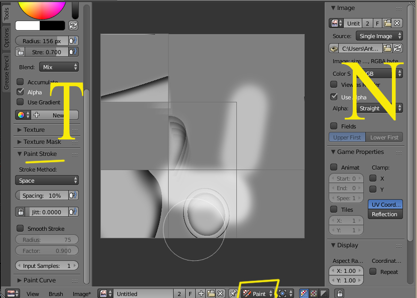 Si estas en el UV/Image Editor, tienes los paneles laterales que se abren con letra T y con letra n cuando estás en PAINT