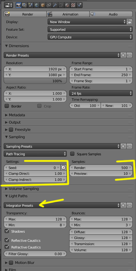 Luego en los Lights Paths también se puede cambiar el valor para poner los rebotes de luz, y que ya vienen preconfigurados unos valores para probarlos.