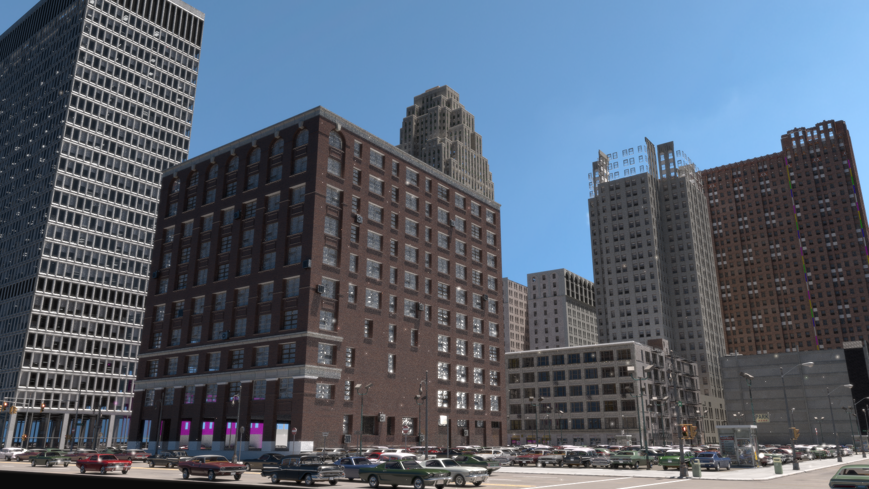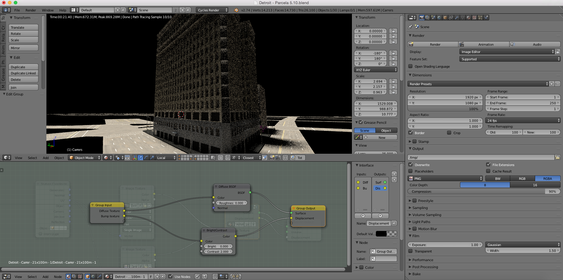 Buenos días. Muchas gracias por responder. He estado haciendo pruebas y al final, solo he dejado el edificio de la izquierda (porque es el que veo el defecto más claramente), el asfalto, la luz y el background lo he quitado y le he puesto un nodo background de color negro para comprobar.