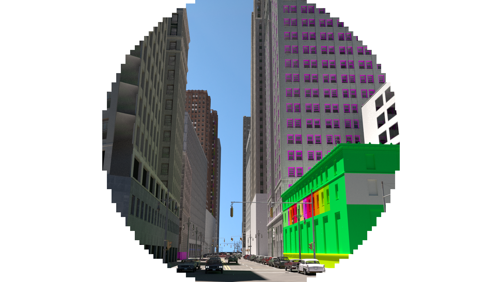 Estoy haciendo un modelado de una ciudad y mientras lo voy haciendo, voy intentando mejorar iluminación, y, aunque esté bastante verde, quiero intentar ir puliendo el render.
