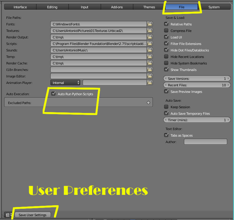 Luego guardas esa nueva configuración con Save User Settings para qué cuando se vuelva a abrir Blender, este activa.