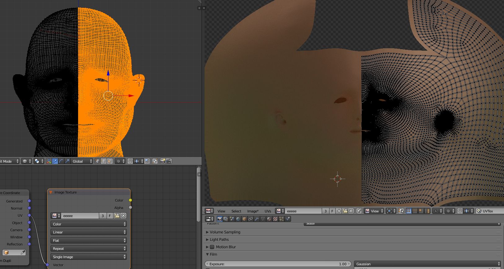 Y de esa última imagen, lo que podrías hacer es pintarle luego los labios, cuando tengas la textura de imagen, con el mismo Texture Paint y luego si quieres, se retoca con Gimp que es más sencillo de manipular las imágenes.