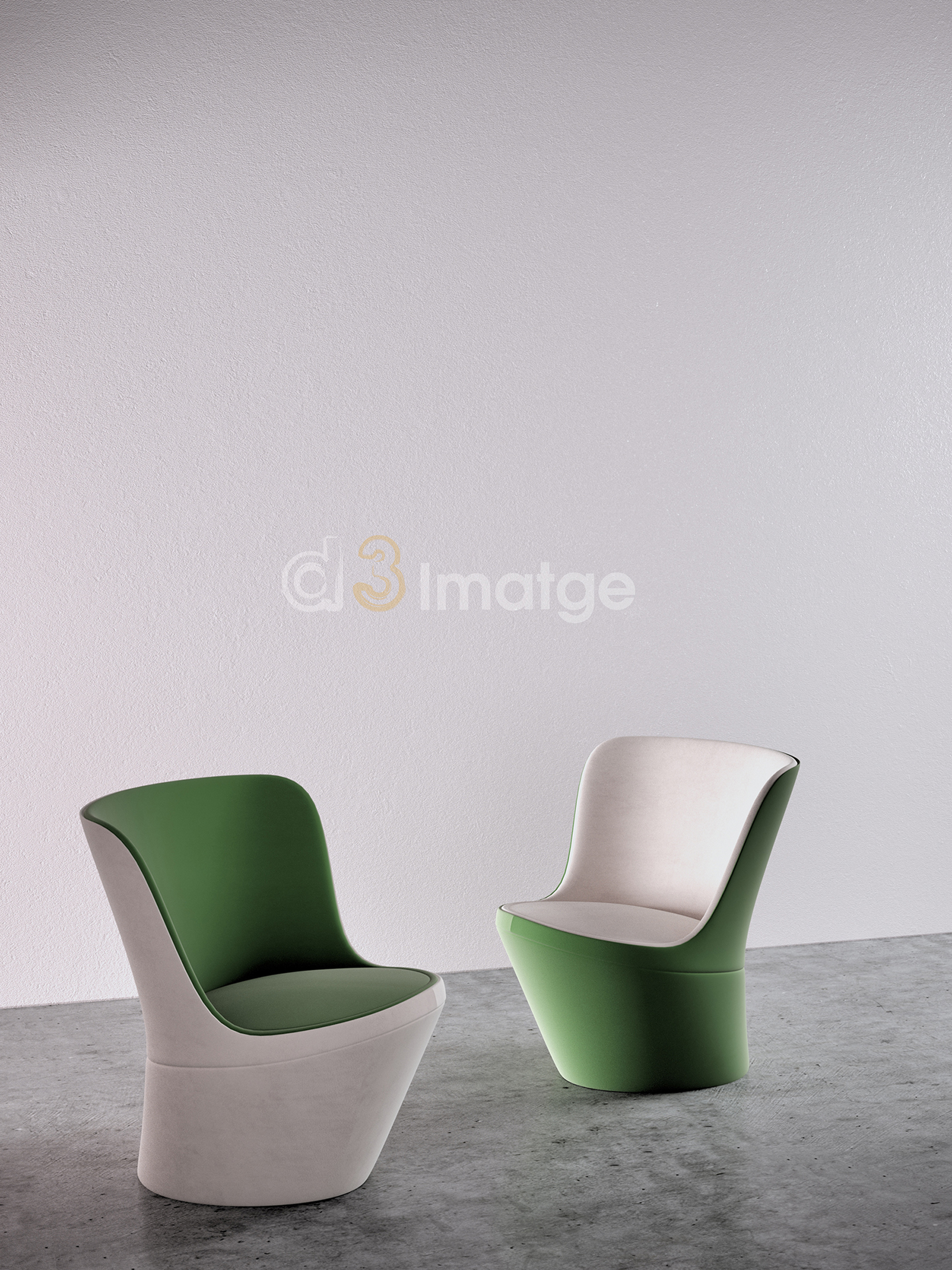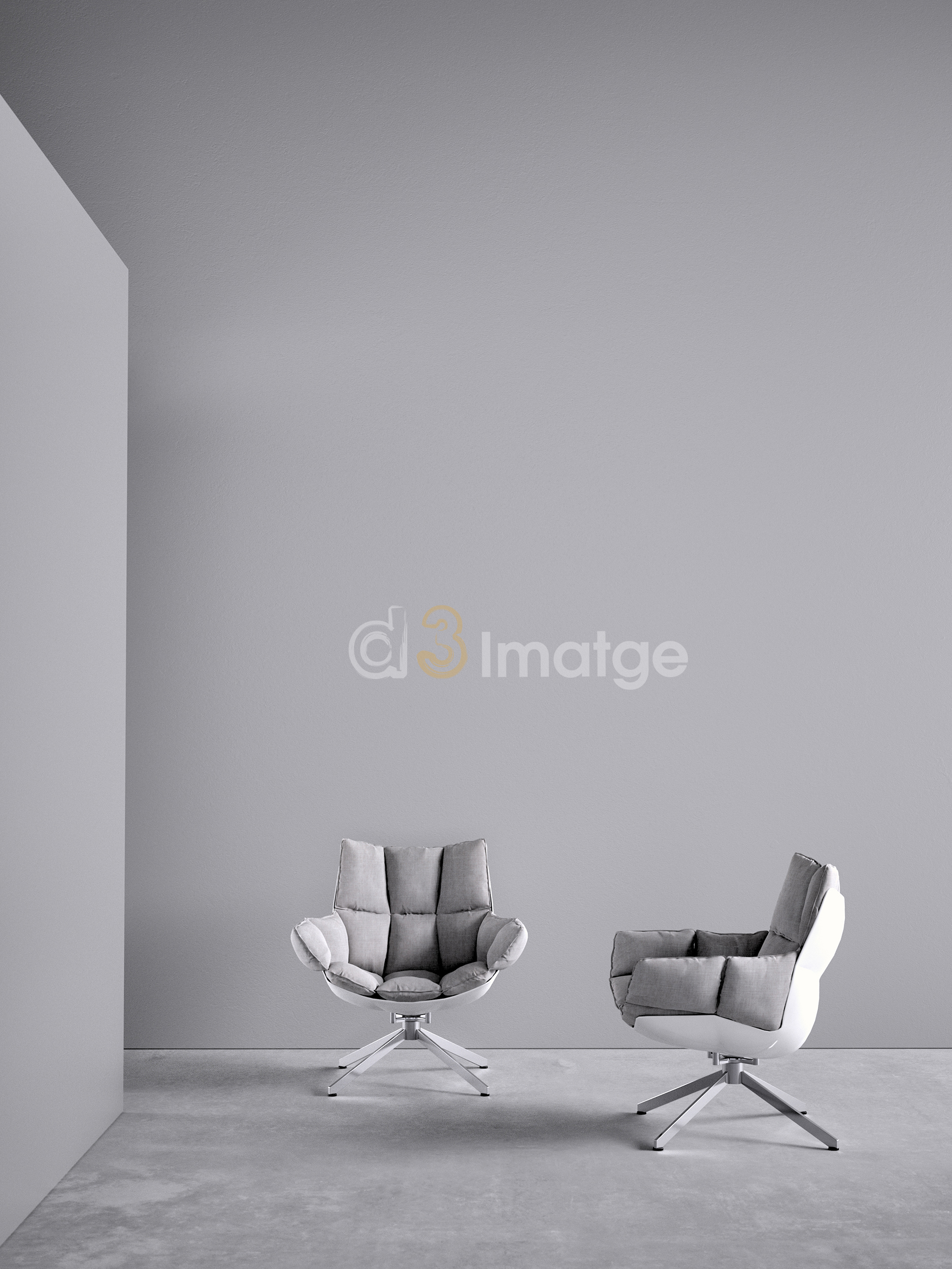 Representación de producto 3D, espacio minimalista butacas Husk H2G y Sad.