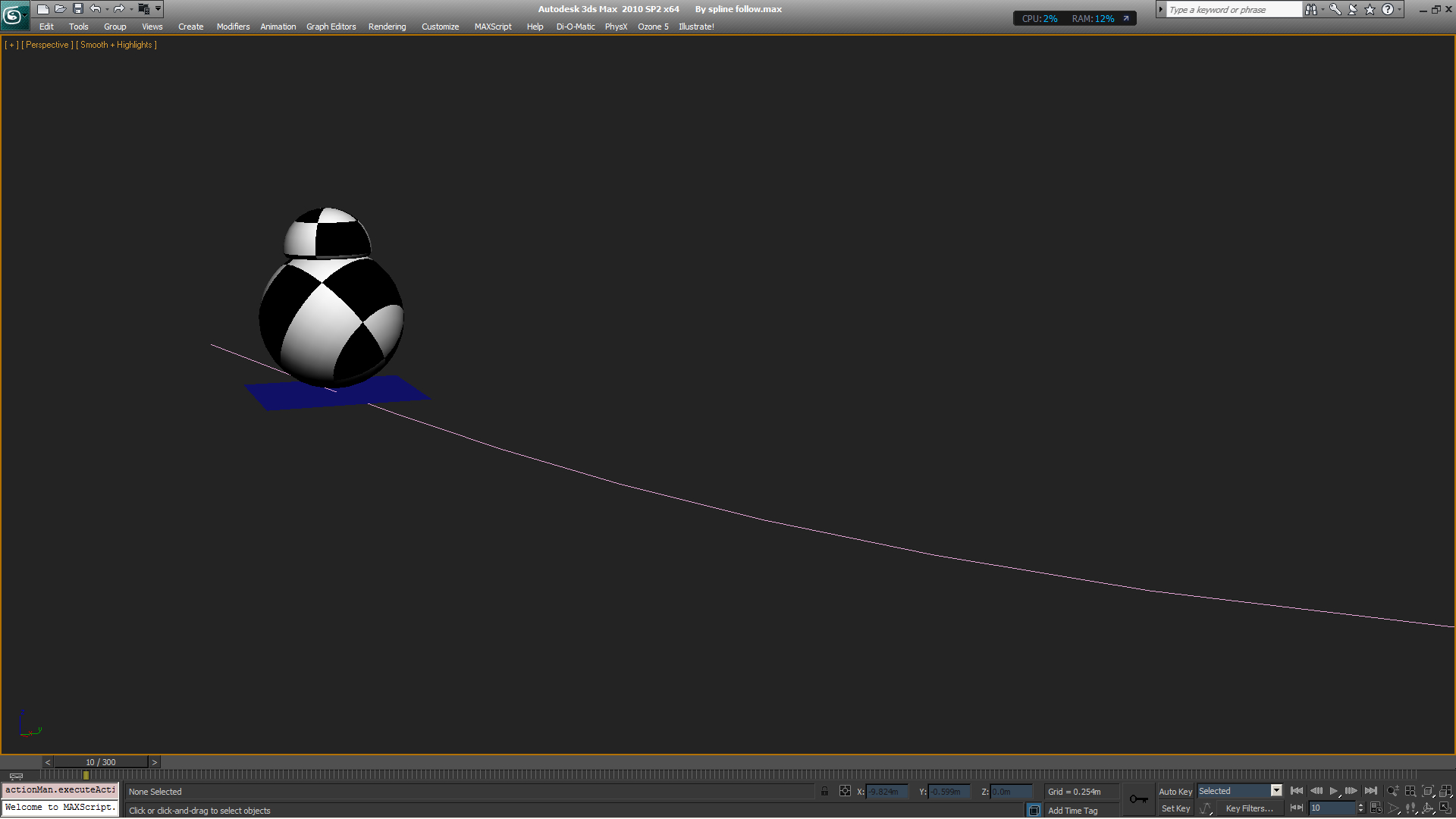 En by Spline follow el procedimiento es atachar la esfera body (con select and enlace) vinculándola al plano tracker, el cual postura una constraint de animación que es Path constraint.