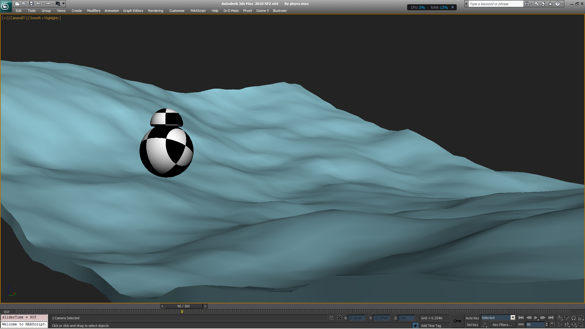 En el caso de by PhysX es un poco más sencillo, se resuelve la colisión de la esfera sobre un terreno desigual (con PhysX, Reactor o RayFire, etc) en este caso nos evitamos la programación script de la rotación TCB pues eso se hace automáticamente por PhysX.