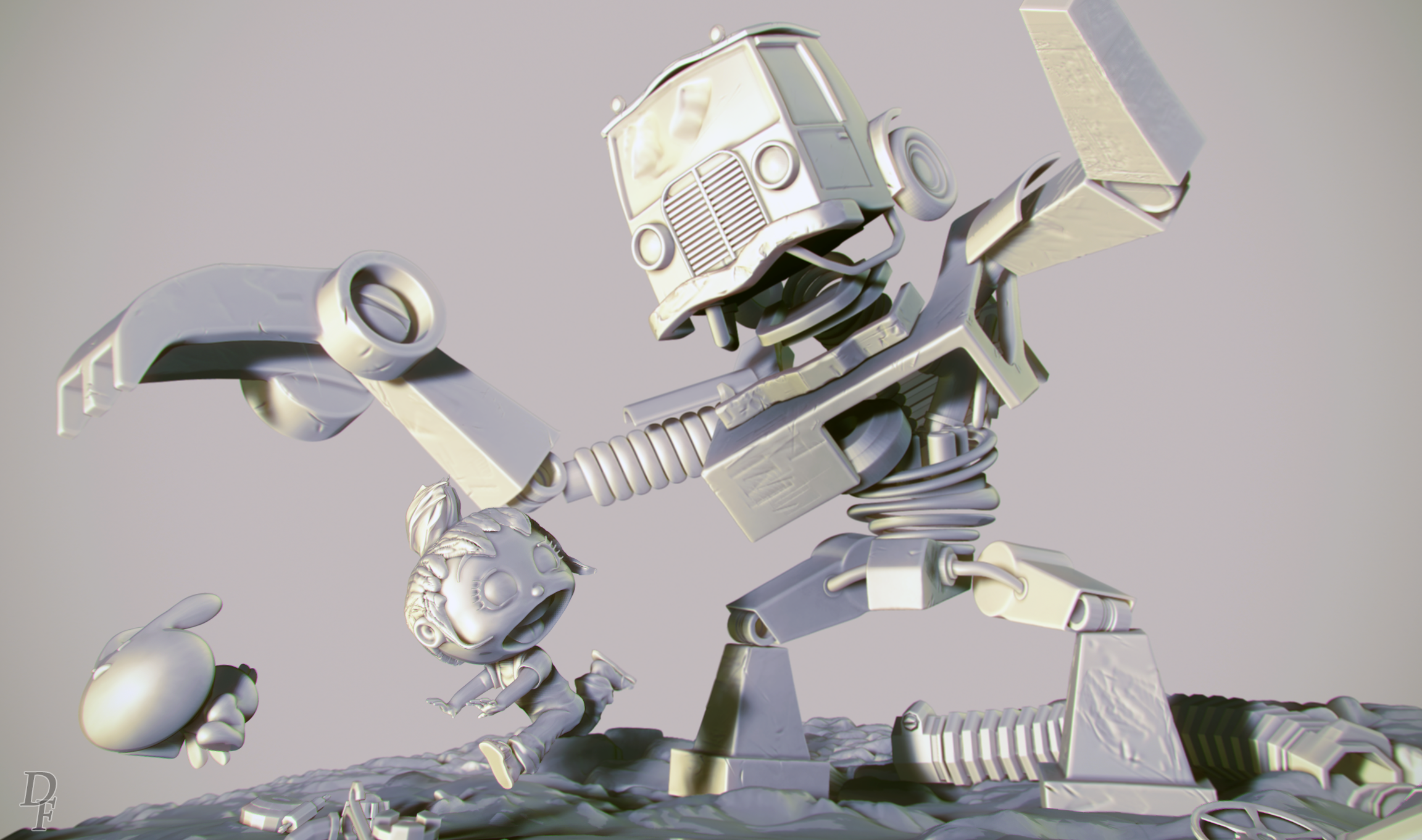 Saludos, comparto un reto personal, es la primera vez que paso un concept 2d a 3d y me lo he pasado pipa además de ejercicio como evolución, el concept es de un tal Sean Le, e intentado buscar más de él, pero al parecer hay unos cuantos con ese nombre, todo en ZBrush con algunos pases extra de materiales.