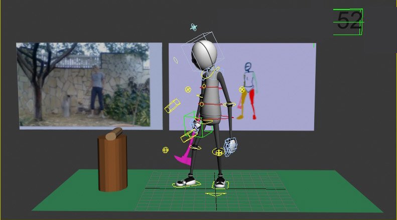 Frames 1-22: En este giro de cabeza, la cadera se tiene que ver afectada. Prácticamente cualquier movimiento que haga una persona estando de pie afectará a la cadera. Si te fijas en la referencia, la cadera se mueve ligeramente, lo que ayuda a que el centro de gravedad varíe y el hacha empiece a oscilar. En tu animación, los brazos se mueven de forma aislada y el hacha va unida al brazo sin overlap. Estudia bien la referencia (yo apenas la veo bien) para ver cómo empieza el movimiento y de dónde parte. Y recuerda qué cualquier cosa qué pese necesita overlap y lentitud para iniciar (o terminar) un movimiento.