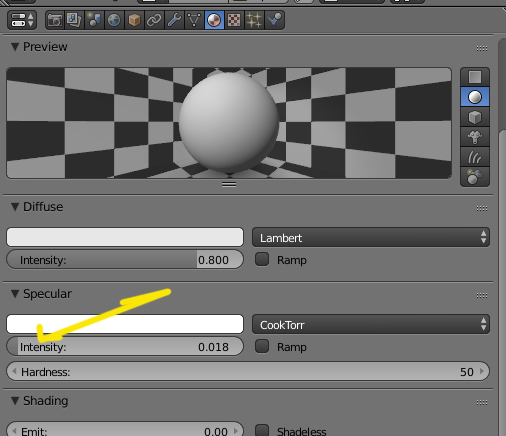 Otra cosa sería bajarle el brillo un poco, o sea, si estas utilizando el motor de render Blender, sería bajarle el Specular.