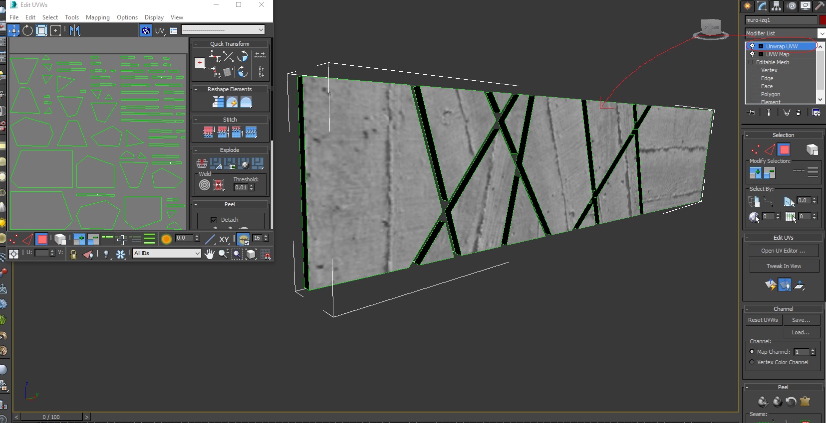 Lo que quiero hacer es sacar mapas chicos con render to texture y después editarlos con un programa gráfico, cambiando la resolución y arreglando la textura. Para eso apliqué Unwrap UVW sobre el modificador UVW map que ya estaba antes.