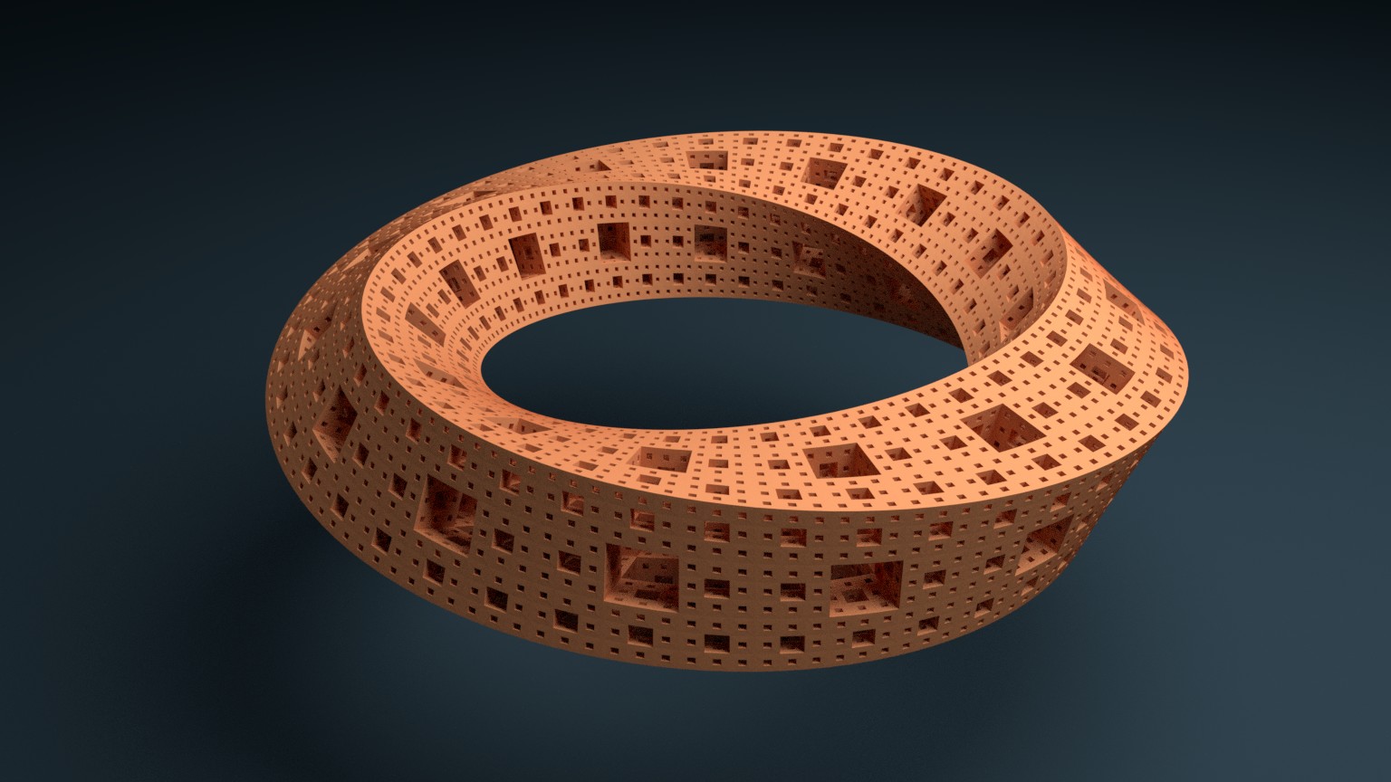 Pues eso, todo juntito, la esponja de Menger y luego girado con el modificador Simple Deform para conseguir algo parecido a la cinta de Moebius.