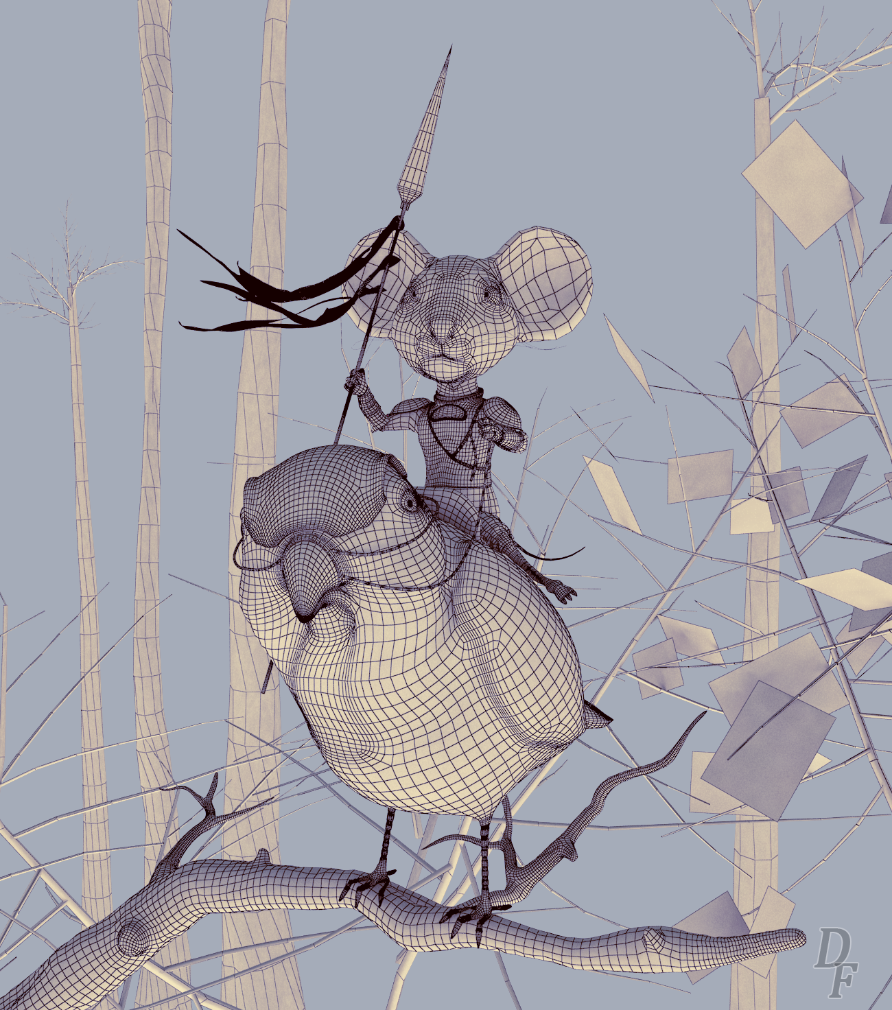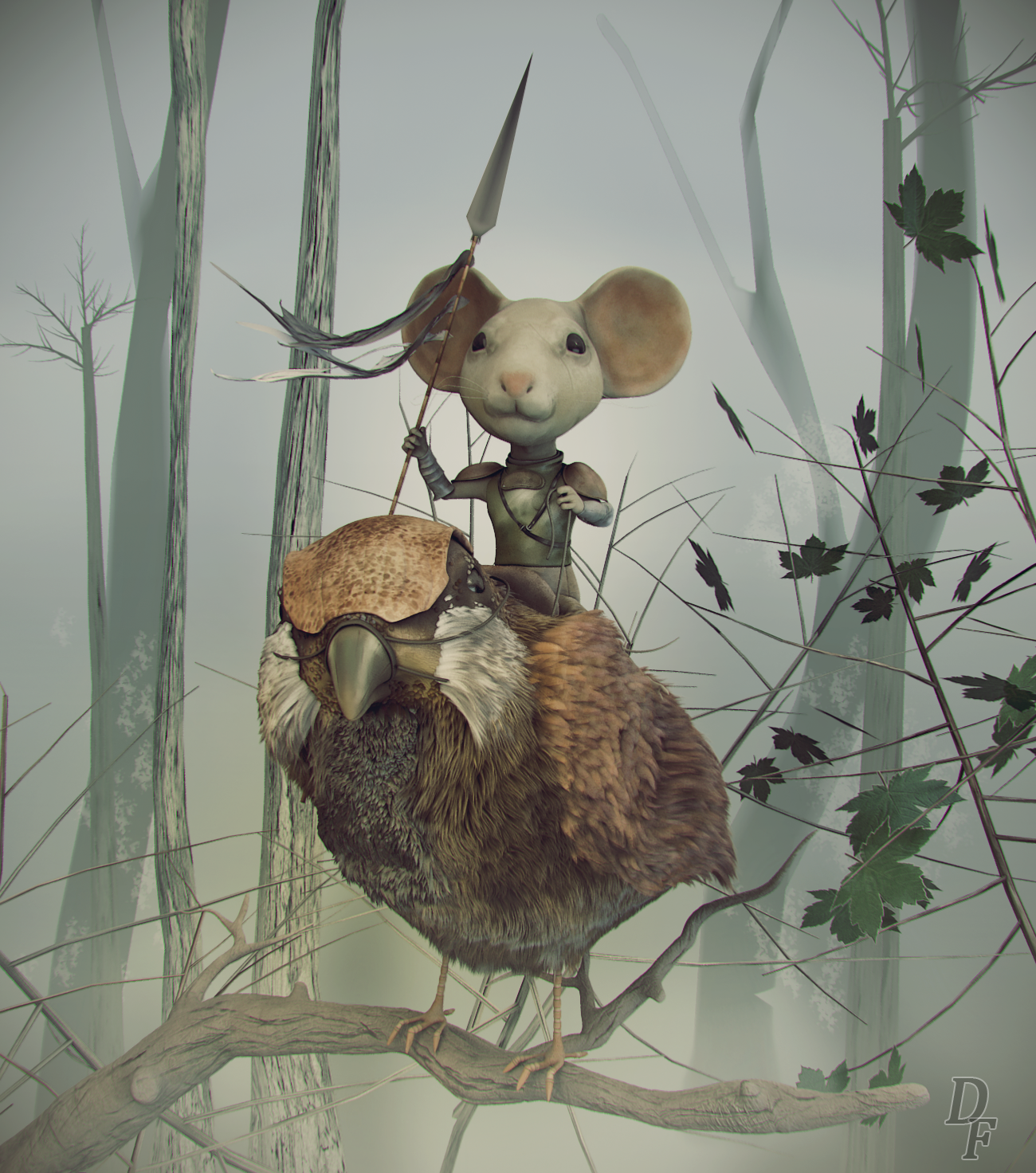 Muchas gracias Sergio, pues tienes toda la razón y la verdad que no me di cuenta de poner algo de flexión a las hojas, un despiste de esos tontos, y, aunque mi intención no era renovarlo, pero me vi obligado a poner ciertas cosas a mi modo de interpretación, el concept original si te das cuenta los 2 personajes están como muy lejos y la lanza del ratón es inmensa, y no me cuadraba en la cámara además de que no se apreciaría el trabajo de estos en mí versión, el tipo de acabado como de ilustración no le he mencionado, pero ha sido con el software Topaz de Photoshop después de hacer la composición con Nukex, recomiendo esa herramienta muchísimo para los renders estáticos, saludos compi y gracias.