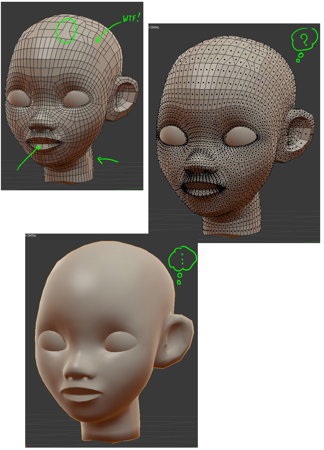 - ¿La cantidad de polígonos usados para estas cabezas, son logradas sin usar algún modificador, como subsurface?