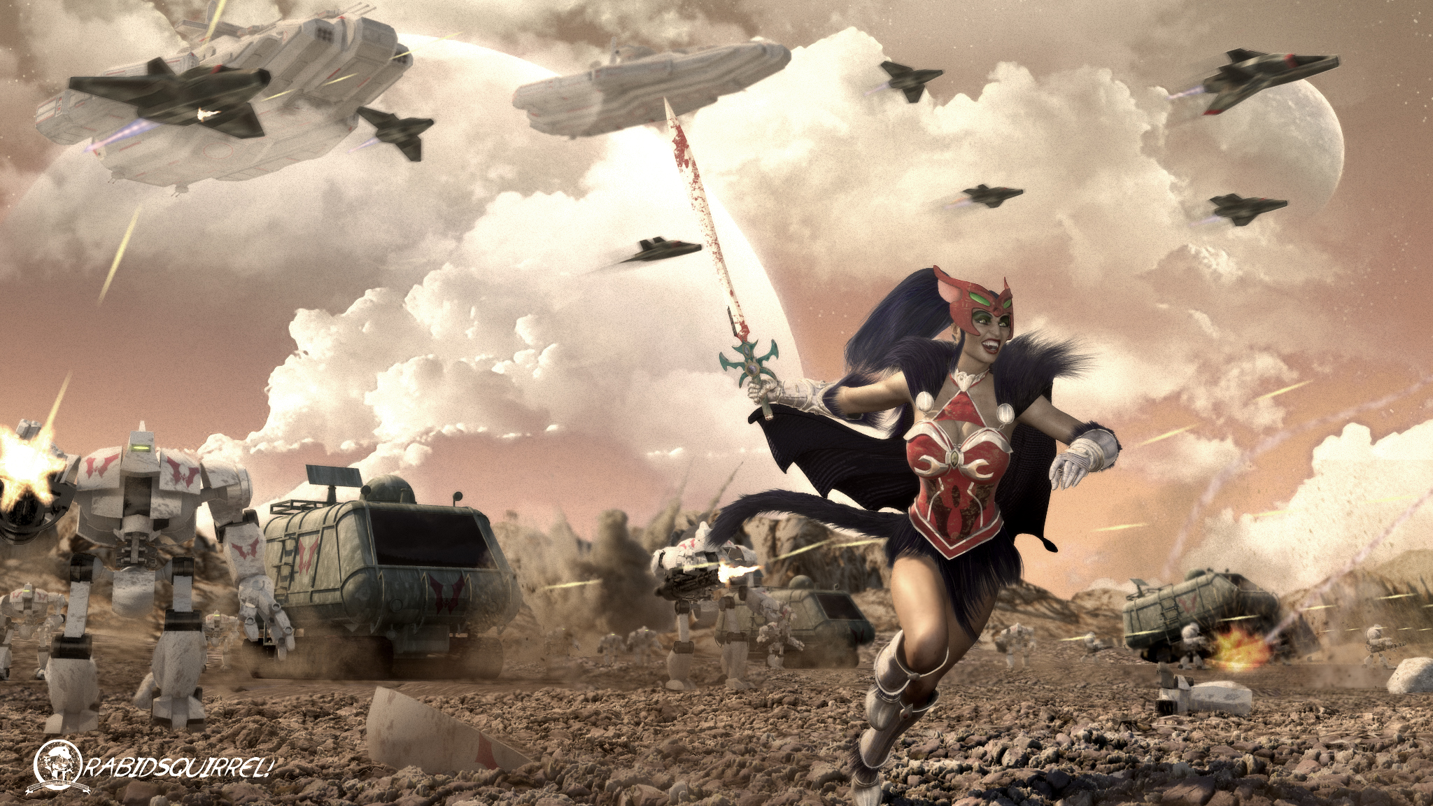 Hola. Como ya hace tiempo que no publico nada, presento mi primer proyecto del 2017. Basado en el programa de los 80 She-ra, construí una escena de una invasión de la Horda en un planeta alienígena. Los Horde tropers han sido adaptados para parecer 100% máquinas a diferencia de los originales, con un modelo que tengo. Catra, una de las capitanas de la Horda, lidera el asalto. Próximamente seguiré con ilustraciones de Shadow Weaver Y Scorpia. Adjunto también el render breakdown.