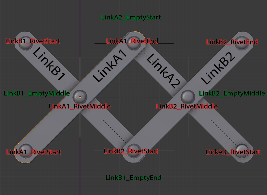 Hay otras opciones, has mirado los drivers? Si rotas el plano rojo rotarán todos los planos simulando el movimiento de unas tijeras. En la escena hay 4 objetos uno es el que movemos, el resto de objetos tienen puesto 1 driver cada uno, solo eso y luego una restricción de rotación para qué las tijeras no abran o cierren más de la cuenta.