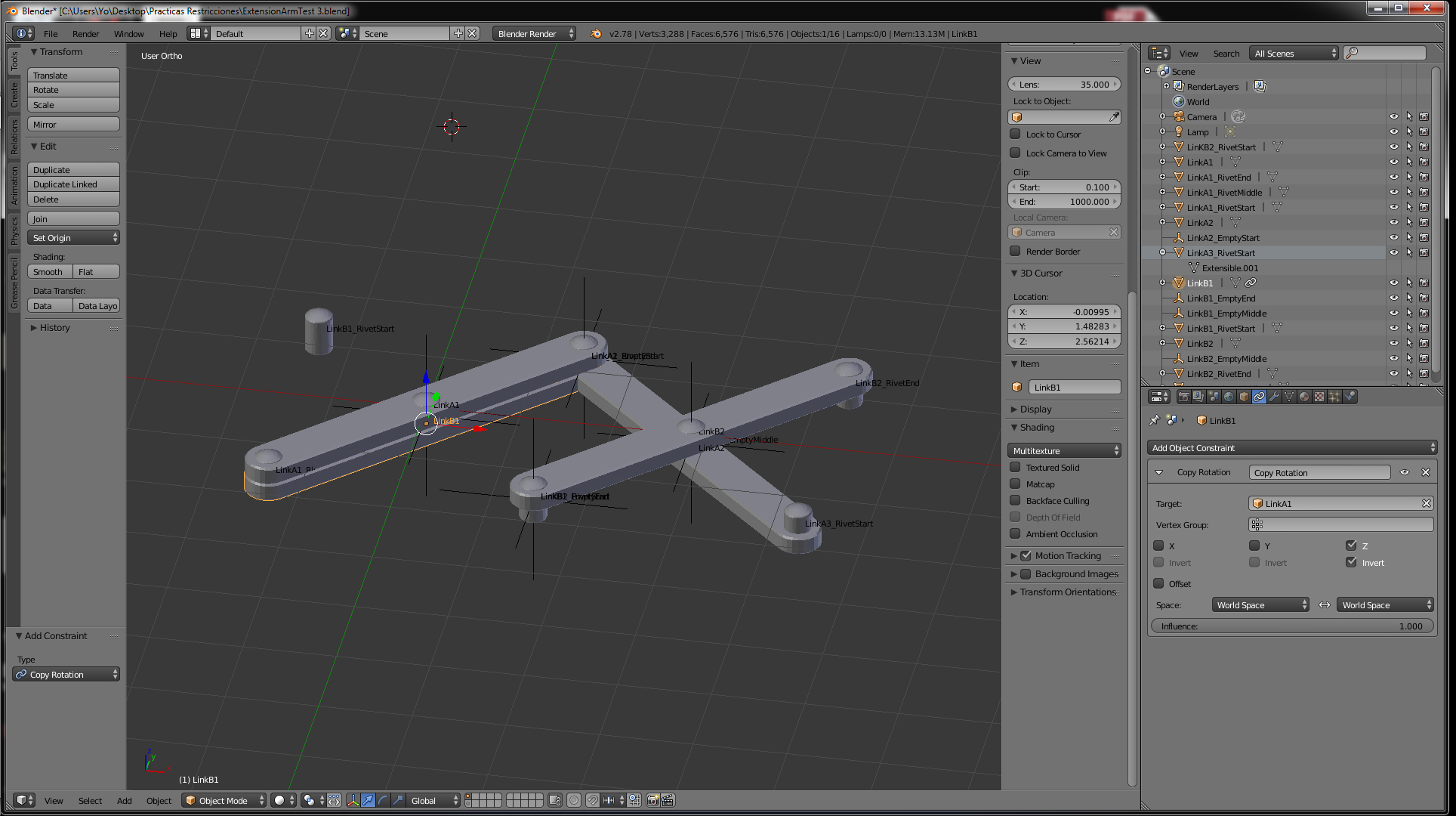 ¿Por qué es tan complicado reconocer 2 o 3 restricciones tipo eje de giro, deslizante o tope? Es increíble. Apenas entiendo cómo funciona una sola de las restricciones de Blender. No entiendo la lógica qué se usó en su día para crear las restricciones en Blender. Para realizar una conexión entre 2 objetos hay que emparentar, añadir un Empty auxiliar y además un par de restricciones. Dos objetos relacionados o conectados por un eje, unas tijeras, por ejemplo, y el Outliner parece un menú de restaurante con tanto objeto y complemento que hay que añadir. Que son solo 3 objetos, oiga.