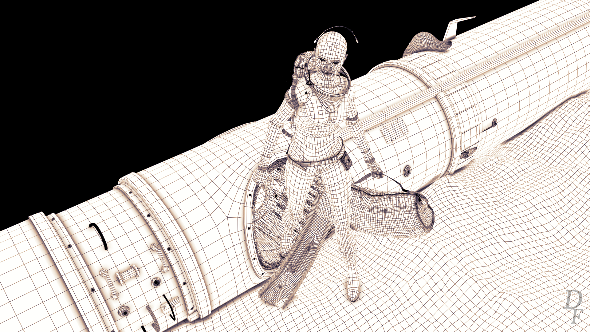 Modelado del personaje y ropa en ZBrush texturizado en el mismo, retopología con Maya Modelado de la nave 3dsmax y texturizado en Substance Painter, Render con Arnold composición final en Nukex, Adobe Photoshop y Topaz, saludos.