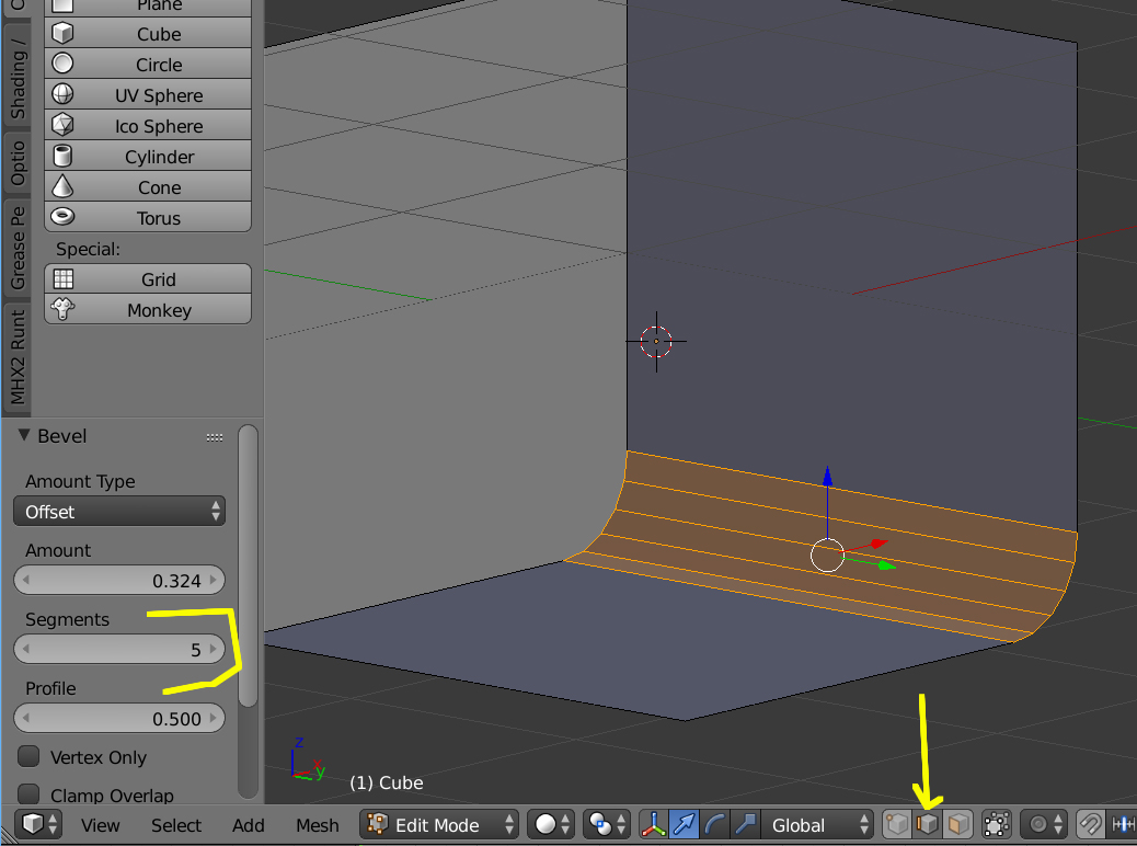 O sea, seleccione estando en modo edición y con los edges seleccionados, el Edge que quieres redondear y presionas CTRL+B y en el panel de la izquierda subes el valor de los segmentos (Segments).