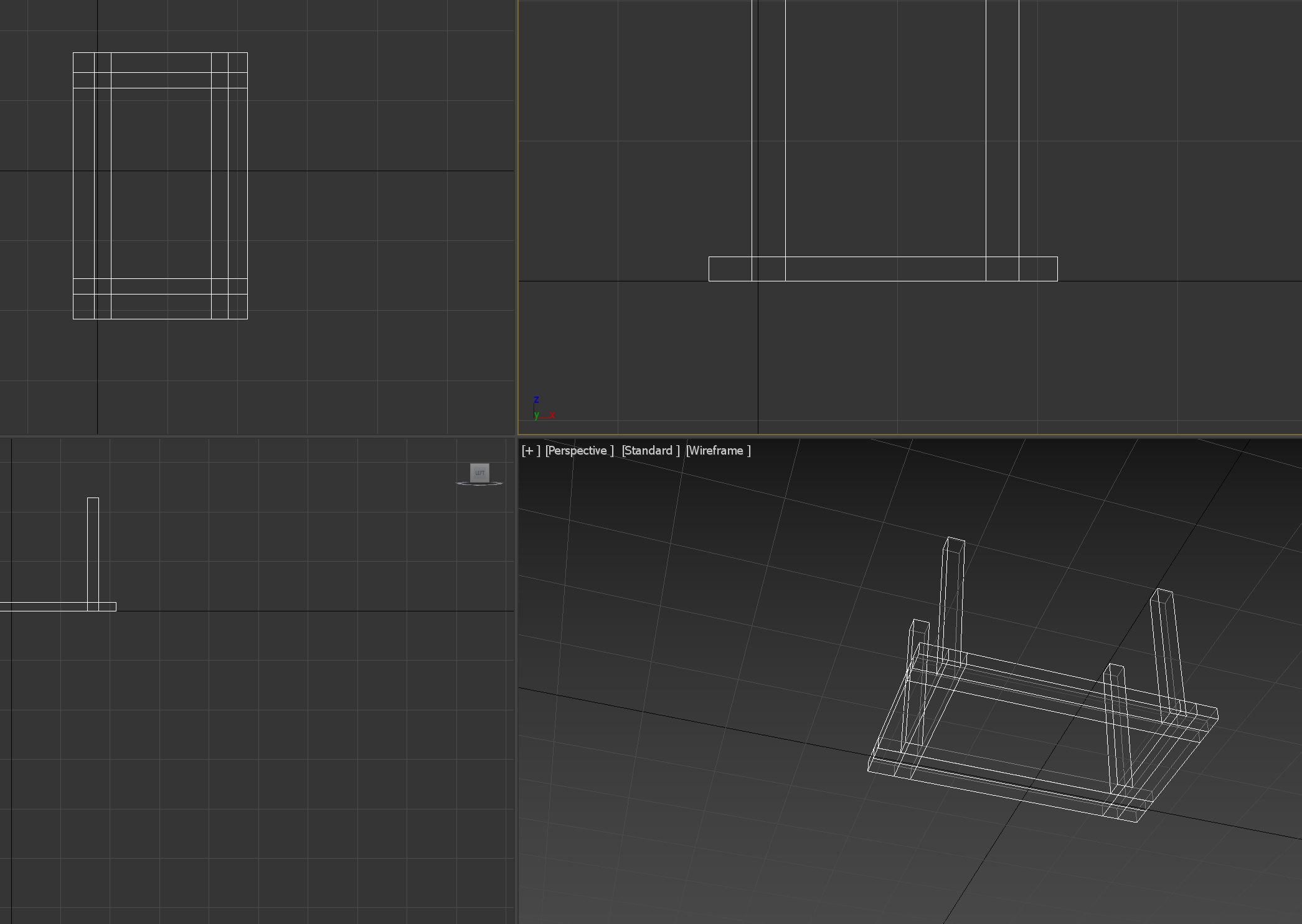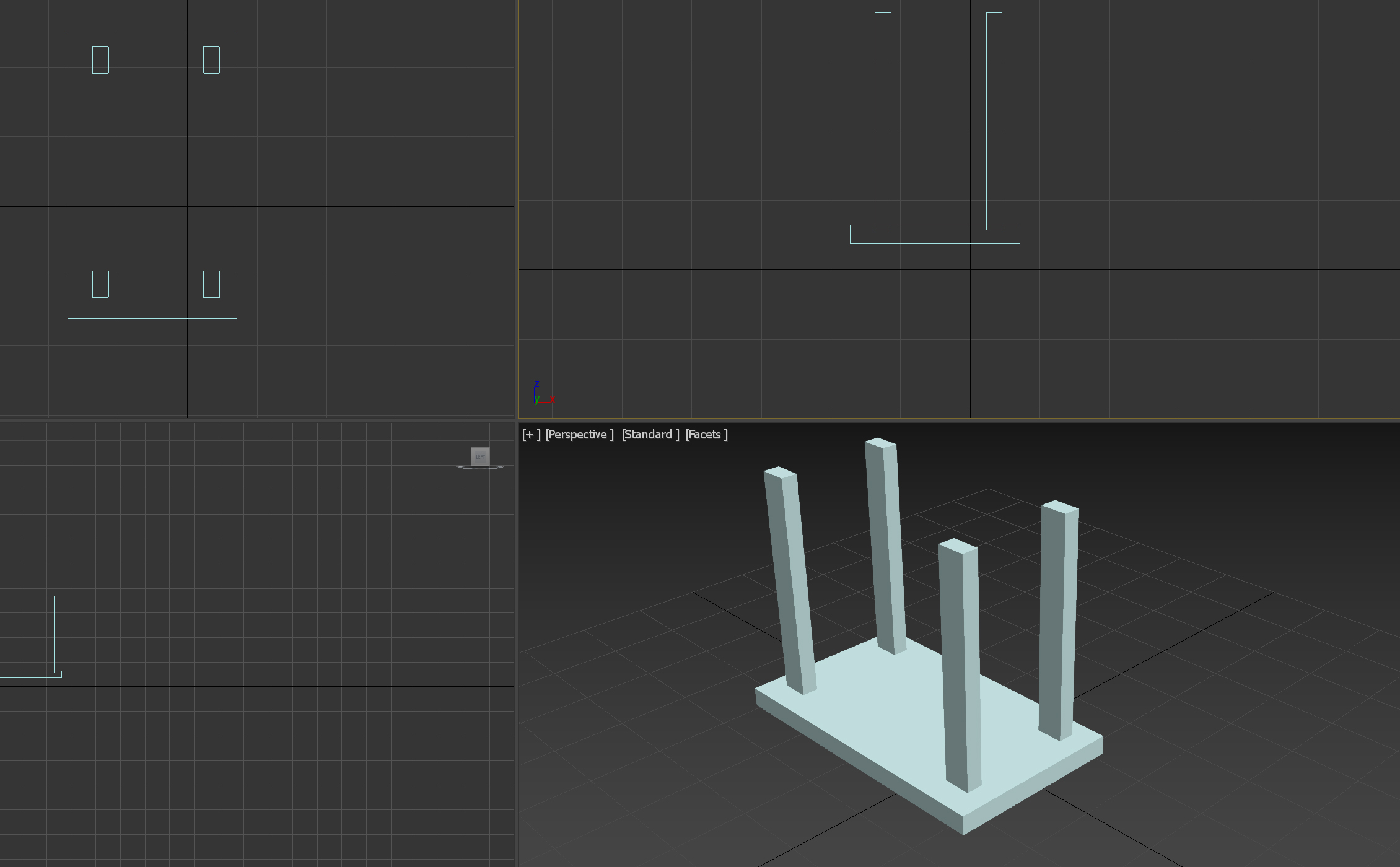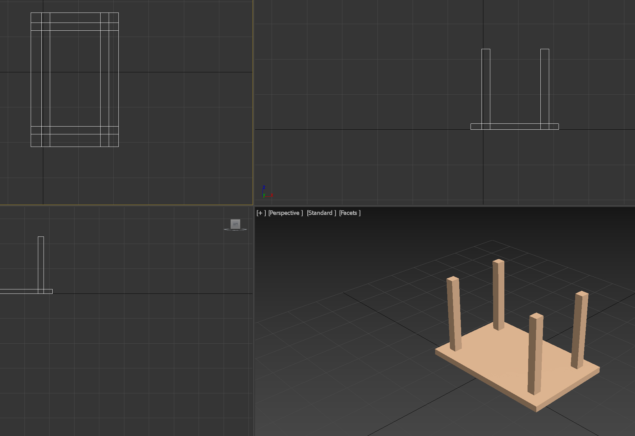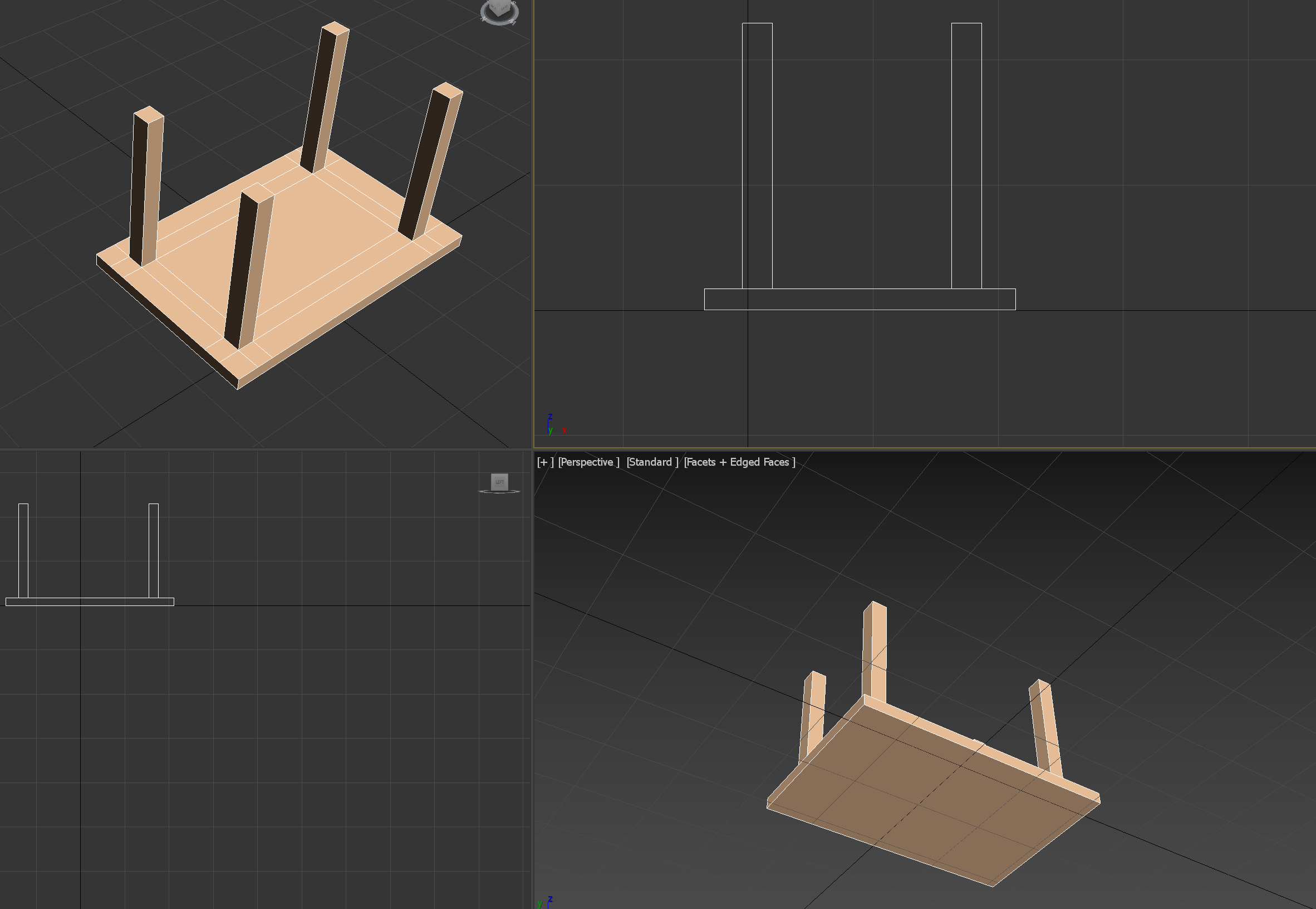 Hola estoy intentando modelar unas piezas, pero no sé si es que quiero ser demasiado preciso y me estoy volviendo loco o lo ideal sería hacerlo así, a ver qué me podéis decir, por ejemplo, para modelar una simple mesa lo ideal sería hacer la tabla y las patas con boxes y hacerle un attach, bastante sencillo (foto1) o crear un box y sacarle las 4 patas haciendo Edges y extruirlas que es bastante tedioso Para según qué cosas (foto2). Es que estoy intentando hacer unas ventanas en una pared, pero sin agujero ni nada y no sé si puedo hacer las ventanas y después ponerlas pegadas a la pared o tengo que hacer líneas en la pared e ir sacando de ahí la ventana para que todo quede de un bloque, no sé cuál sería la forma correcta ya que si las pego se quedan las ventanas metidas dentro de la pared y no sé si teóricamente eso es correcto que un polígono se meta dentro de otro. Y después otra cosa si creo Edges a una mesa, por ejemplo, para sacar las patas debería dejarlo como la (foto3) con las líneas por arriba y abajo o puedo borrar las de la parte de abajo y que las de arriba acabes en la nada, bueno sin continuidad quiero decir (foto4). Muchas gracias, por ahora es lo único que me falta para una cosa que estoy haciendo es que no quiero empezar a hacerlo mal desde el principio y en los tutoriales no lo explican.