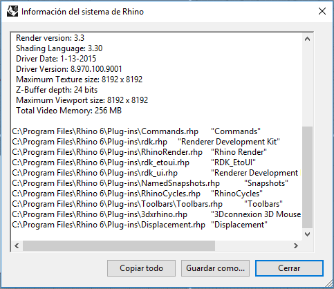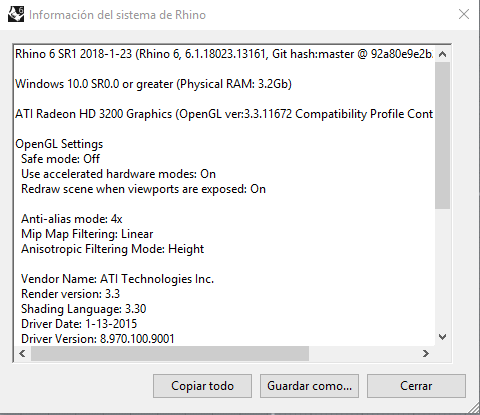 - De tener tarjeta gráfica, te recomiendo actualizar los drivers y activar su funcionamiento en las opciones de Rhino. Se encuentra en Options>View>OpenGL>Use Accelerated Hardware Modes.