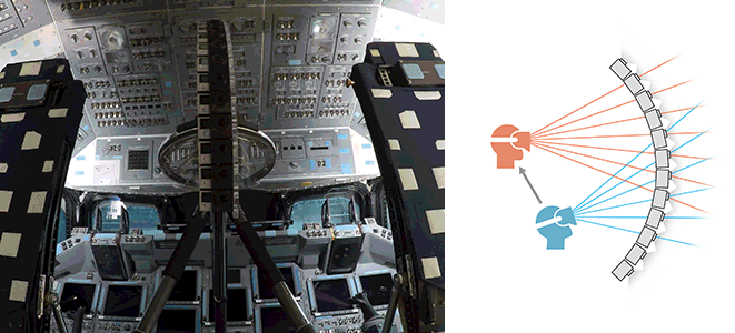 Izquierda: un video de lapso de tiempo de la grabación de un campo de luz esférico en la cubierta de vuelo del transbordador espacial Discovery.