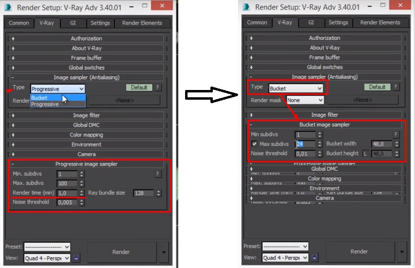 Vray es muy rápido en esa versión y prácticamente automático, pero si quieres un poco de rapidez puedes probar en bajar el 3DS Max de 24 a 12 por ejemplo.