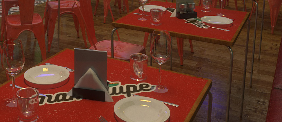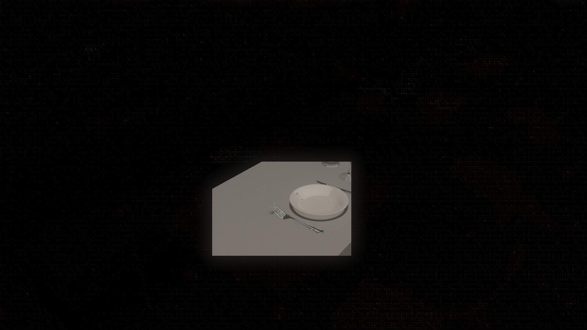 Parece un problema de luces más que nada, cuantas luces hay en escena, se ve mal iluminado, inclusive la sombra de los tenedores es incorrecta.
