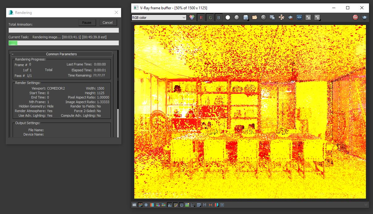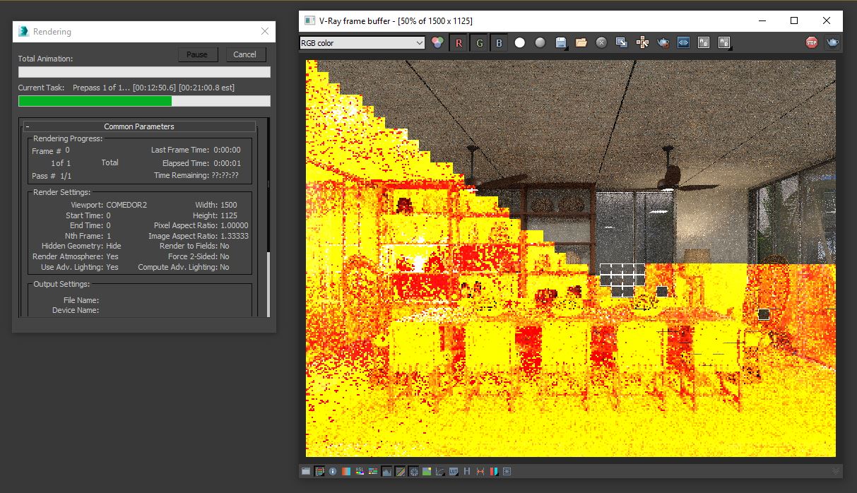 El problema es que, al renderizar en 3ds Max 2016, en ciertas cámaras cuando mando a renderizar en calidad final (1500x1125 píxeles) me saca los renders en amarillo y rojo (cuando hace el Building light caché no se ve el problema, pero se hace evidente cuando está en prepass y render) y en otras cámaras me saca manchas de luces rojas (adjunto imagen).