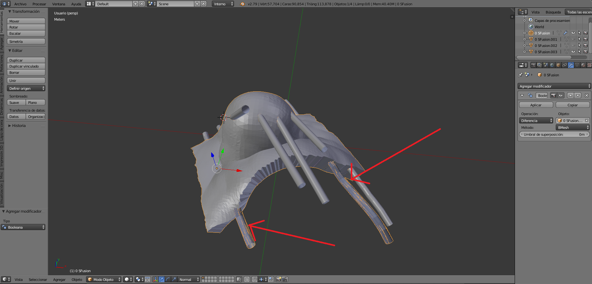 Estoy realizando un proyecto donde tengo que aplicar una operación booleana de diferencia entre las dos mallas de la imagen y en ciertas trayectorias me da problemas y no me realiza la operación correctamente.