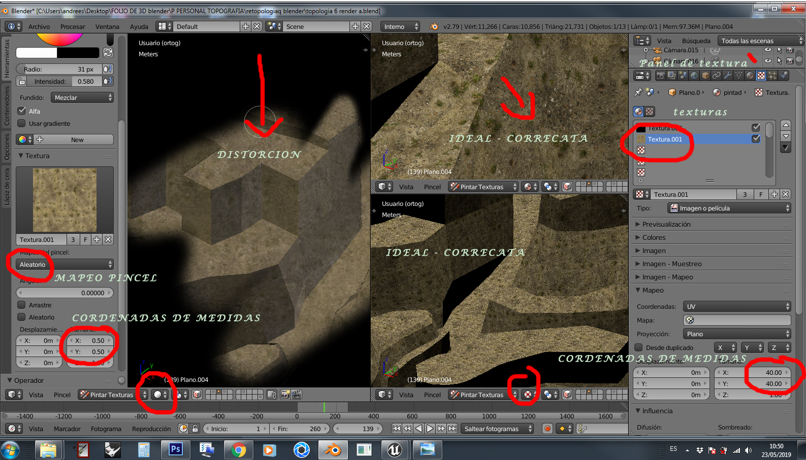 la idea mía es poder texturizar y mesclar más de un textura en ella, pero no tengo idea y el conocimiento suficiente de los nodos, (-si esto fuece en Cycles), por ende aprendí a pintar con la opción (Pintura de textura) en modo render Blender la cual, creo que más factible y cómoda para mí rendimiento del PC, - eh a qui donde entra mi duda! si muy bien esto; es más de lo que esperaba, por que, a la hora de añadir textura en el panel de texturas, se distorsiona la pintura a la hora de pintar con pincel *(me di cuenta, aunque modifique la escala tanto en el picel y textura, como menor o mayor escala sigue distorsionando los pigmentos o la pintura)*, siendo que de EN MODO - visualización textura se aprecia mejor que en MODO material-