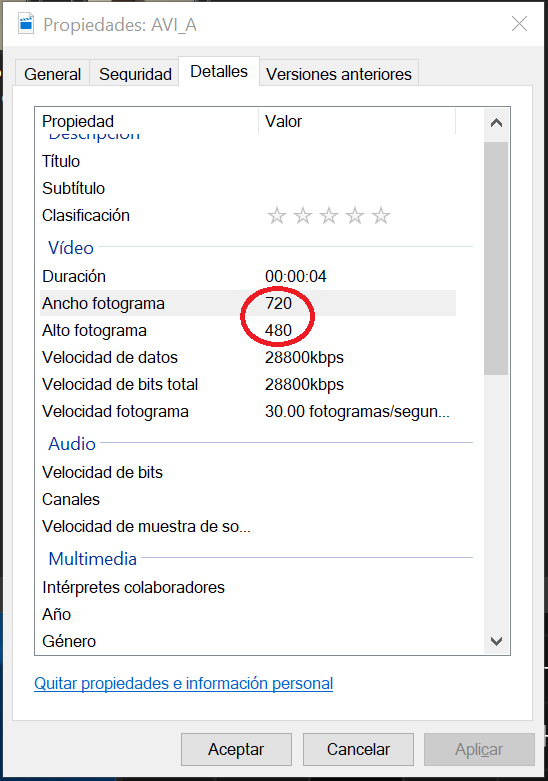 Ahora he seleccionado otro códec, el Mjpeg Compressor, y el vídeo se exporta con la resolución de salida que le había indicado al programa, todo correcto :)
