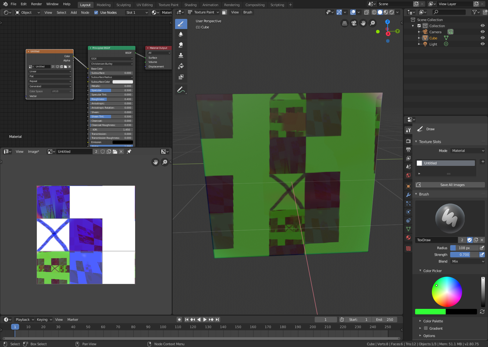Buenas tardes. Me ha surgido un problema que no consigo arreglar. Parto de un sencillo cubo, despliego las UVS, añado el nodo de la textura y a la hora de pintar, aunque surge el color que quiero, bajo la capa de pintura que le aplico surgen manchas que son reproducciones en miniatura de las mismas UVS, que no logro eliminar. ¿Alguien puede ayudarme? Muchas gracias.
