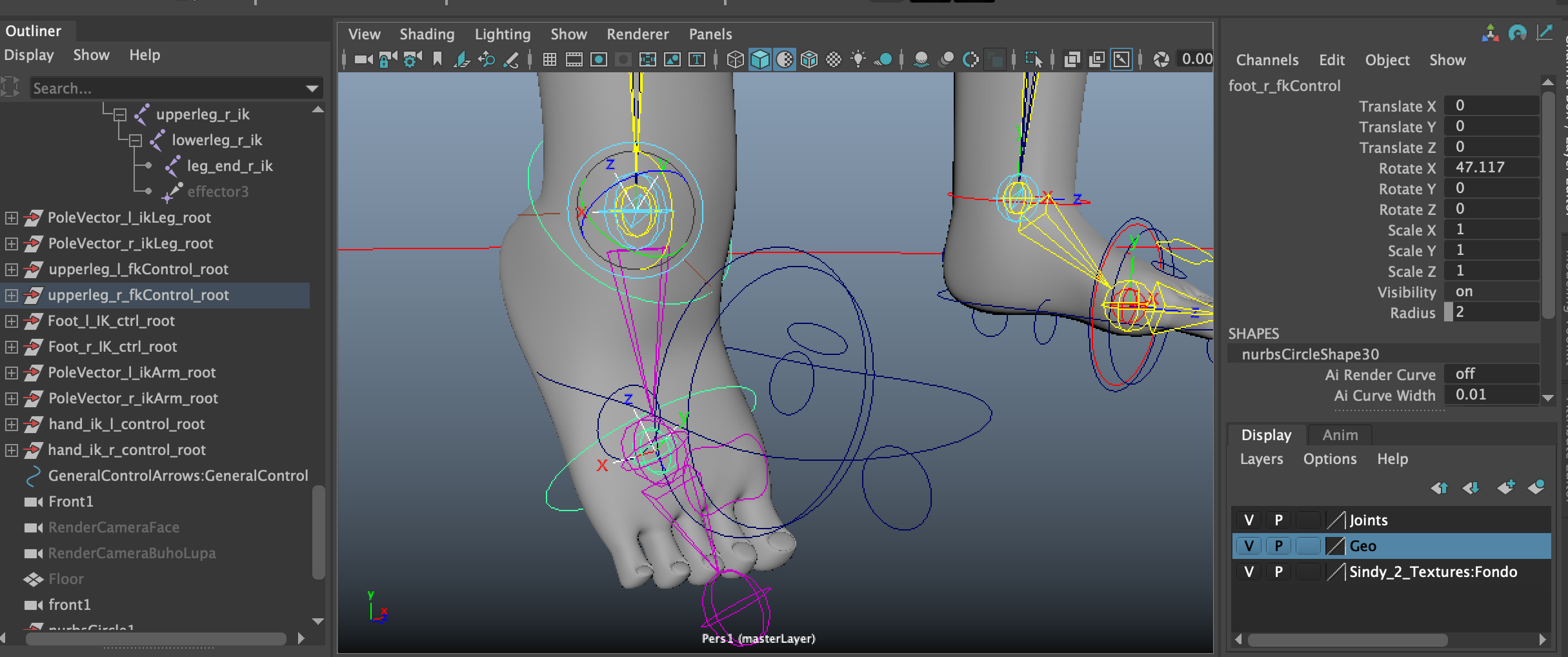 Hola, tengo un problema a la hora de mover en IK un lado del cuerpo del personaje. Tengo creado el lado izquierdo del personaje y se mueve perfectamente en IK y FK, pero al hacer el Duplicate Special para tener el lado derecho consigo que en FK se mueva bien (imagen 1) aunque no pasa lo mismo cuando lo tengo en IK que se mueven los controles y joints, pero no se mueve la geometría (imagen 2). ¿Sabéis cuál puede ser el problema para que en IK no se esté llevado la geometría?