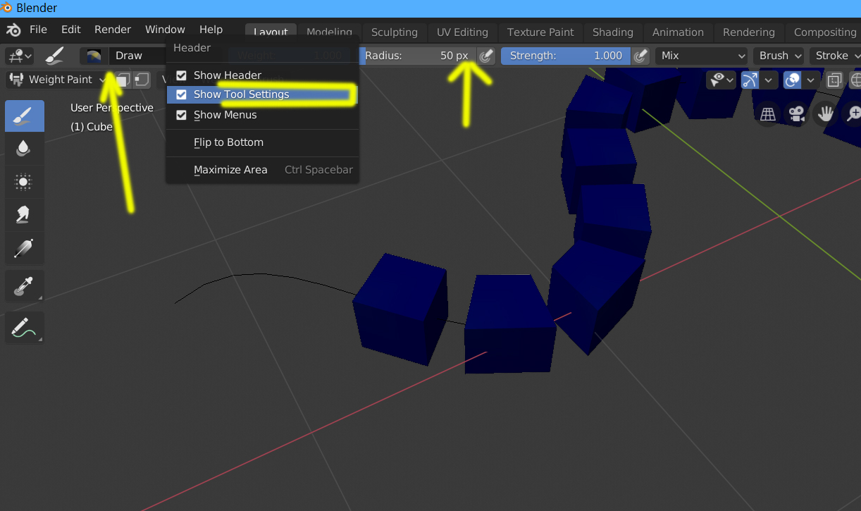 Por cierto, si quieres que te salgan los valores de las herramientas en la parte superior, solo acerca el puntero del ratón en la parte superior y con clic derecho te sale la ventana de Show Tool Settings