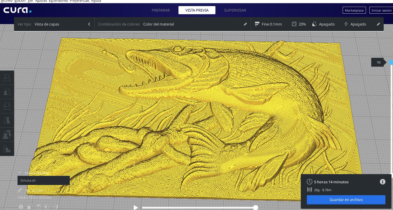 Os adjunto la imagen para que lo podáis ver. A lo que me refiero es al cuerpo del pez, ya que como dentro va relleno y un poco de borde, no importa tanto el espesor de capa, pero en la parte superior sí, para tener más calidad.