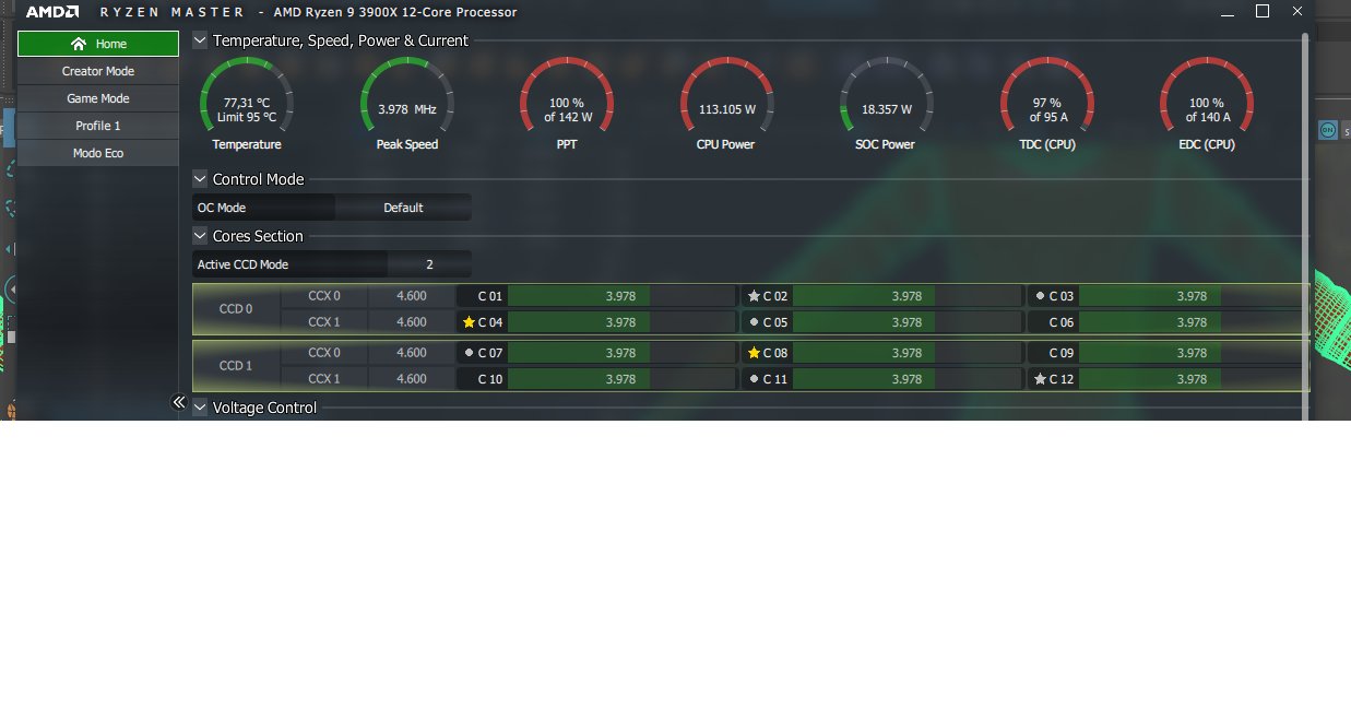 Buenas a todos. Tengo un Ryzen 9 3900 con el que trabajo modelando y renderizando. El cooler que tengo es un NOCTUA, pero no el nh15, sino el de 12, más pequeño. Adjunto esta captura del Ryzen master sin tocar nada, en modo default.
