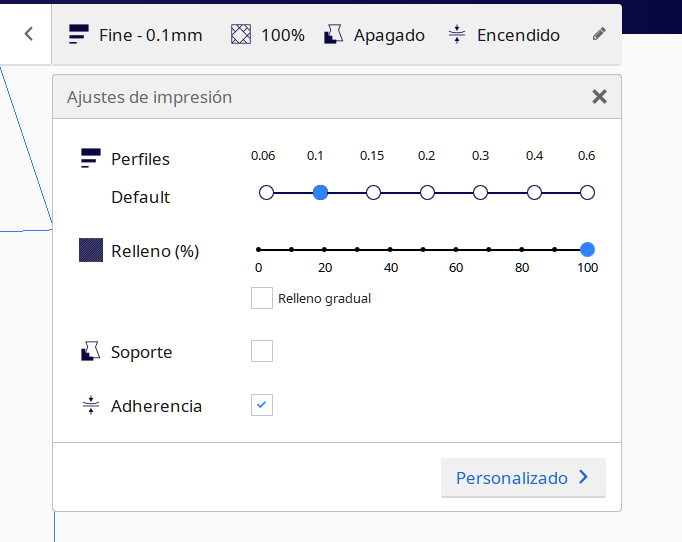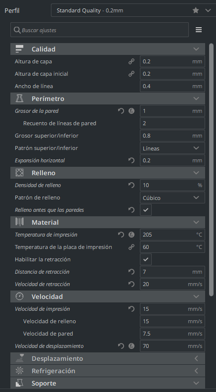 NOTA: no he modificado ningún tipo de parametro. El archivo .stl ha ido de cabeza para CURA y de ahí a gcode (el diseñador que lo ha hecho no daba info). Parametros que he usado: