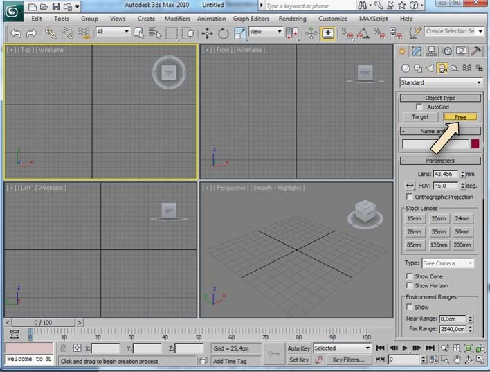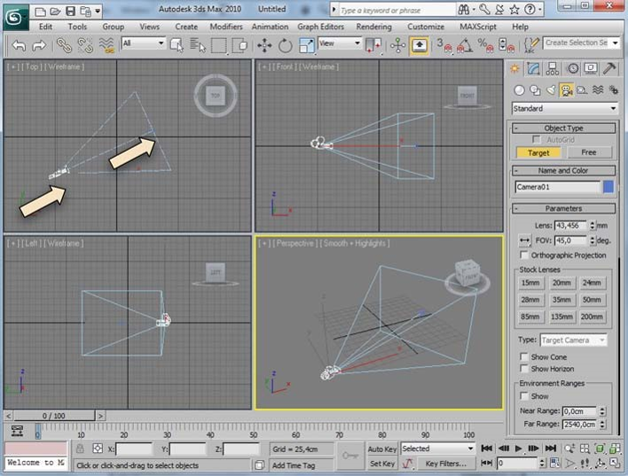 1) Creamos una cámara libre que enfoque a una de las paredes con una lente de aproximadamente un gran angular, alrededor de los 20mm. Esto nos permitirá optimizar el espacio de visualización del espectador.