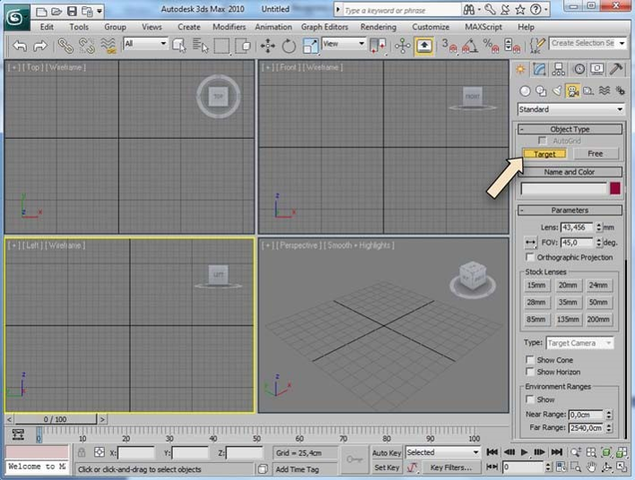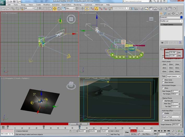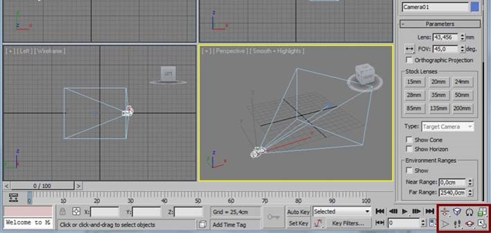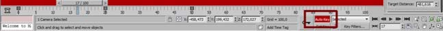 Para ello, se utiliza la herramienta de AutoKey. Con dicha herramienta, vamos variando la posición de la cámara sobre la línea de tiempo, de manera que se crean los fotogramas clave automáticamente en los tiempos y posiciones que vamos actualizando la configuración de la cámara. Además, también sirve para todos los parámetros animables de la cámara, como el Lens FOV.