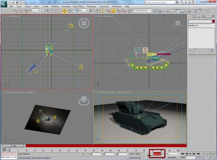 1) Activamos la opción AutoKey de la barra inferior para ir añadiendo fotogramas clave en la animación.