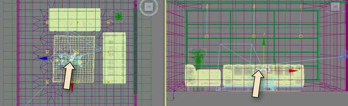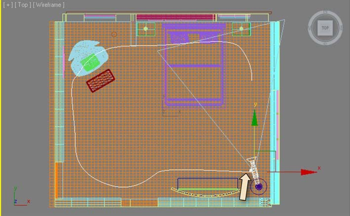 4) Cuando ya hemos colocado la cámara, realizamos una rotación de 360 grados sobre el eje Z de la cámara en el visor Top para asegurarnos de que todo el escenario queda dentro del rango de visión y que el render panorámico que vamos a generar será correcto. (Mientras rotamos en el Top, visualizamos en la vista de cámara).