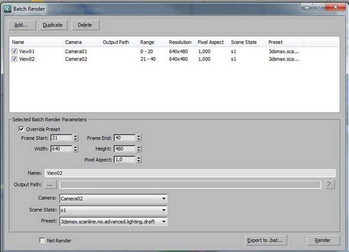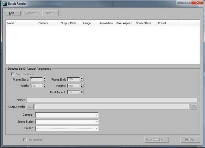 Podemos acceder a ella a través del menú de Render/Batch Render. La abrimos, y nos encontramos con una ventana con diferentes parámetros.