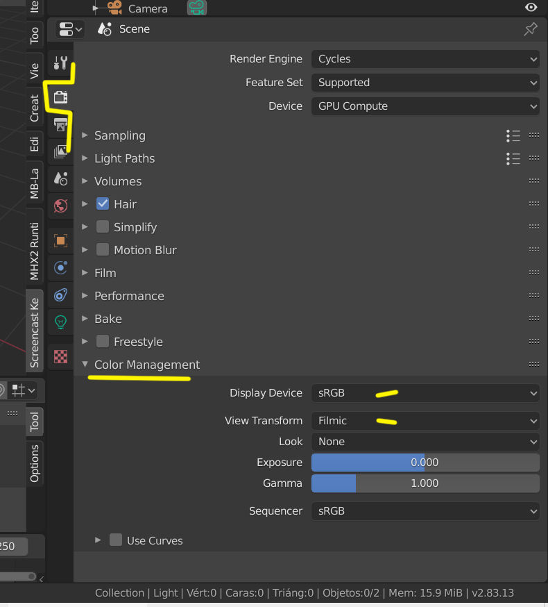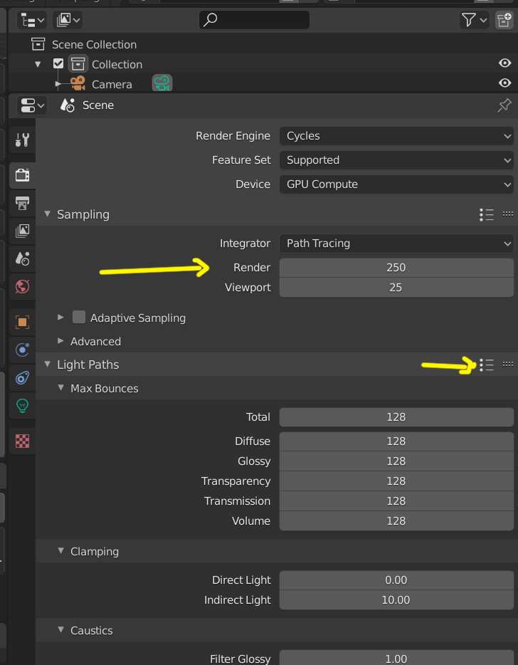 Y para mejorar los renders en Cycles, se sube el valor de Render y se pueden subir los rebotes de luz en Light Paths.